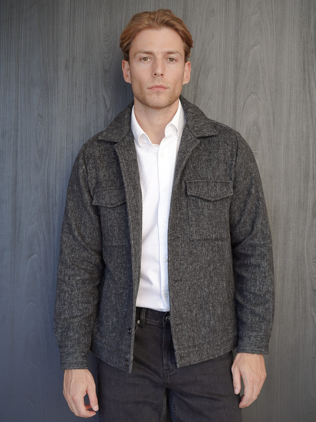 Stay warm and look sharp this winter with our Woollen Trucker Jacket in Charcoal. Designed in a classic trucker style, with modern detailing, this jacket is made from a heavy weight textured wool blend, providing both softness and durability. The double entry side pockets have zip pockets to keep things safe.